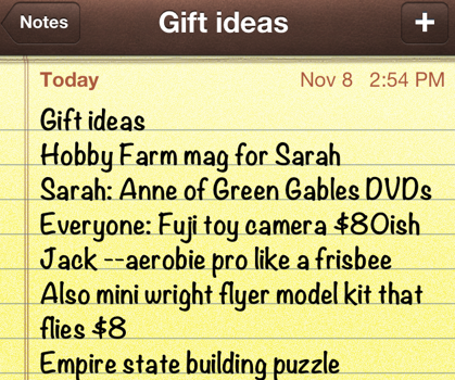 • Keep a running list of gift ideas. Here’s a snippet from mine:
